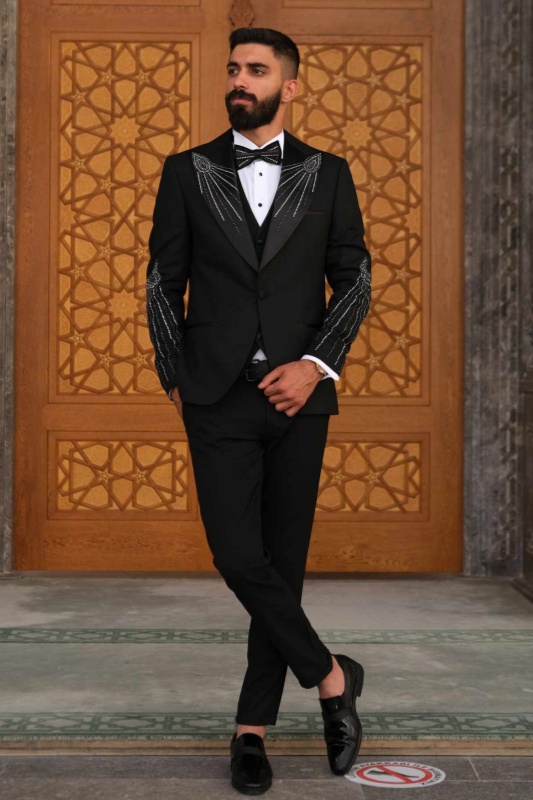 Classic black is always a safe bet for formal occasions, but this suit breaks the monotony. The peak lapel is trimmed with glossy satin, and the beading on the shoulders and sleeves resembles outstretched wings, shimmering subtly under the light—a touch of understated luxury. Paired with a white shirt and a matching bow tie, it exudes both the solemnity of a wedding groom and the aura of a red carpet star, making you elegant and eye-catching in a crowd.
