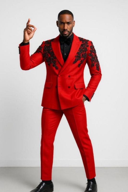 A vibrant red suit exudes star power, while the double-breasted design enhances its commanding presence. Black beads, like vines, entwine the garment, outlining a romantic yet rebellious silhouette against the bright red background, combining the sophistication of vintage courtly style with the sharp edge of modern fashion. Paired with a black shirt and bow tie, it's the perfect choice for weddings and New Year's Eve parties, ensuring you're the most dazzling presence at the event.