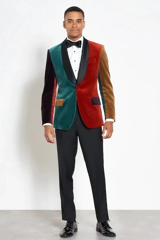Outerwear Design: The core highlight is the use of high-saturation velvet fabrics in various shades of red, green, brown, and black for patchwork design. Different color blocks are separated by clean geometric lines, paired with a classic black satin shawl collar, creating a look that combines the luxurious feel of a vintage velvet gown with a touch of avant-garde artistry. The pockets also feature a contrasting color design, further enhancing the playful patchwork effect.