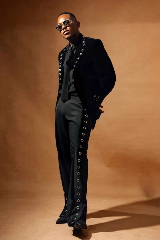 Outerwear Design: The entire garment is made from a soft cherry blossom pink fabric, with a delicate sheen and a warm touch, breaking the monopoly of dark colors on menswear and conveying an elegant and gentle temperament. The shoulders and sides of the suit jacket feature appliqués in the same color scheme, with intricate and delicate floral patterns enhancing the overall sense of luxury and adding layers and artistry to the simple silhouette.