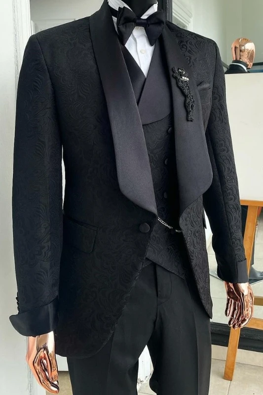 This black satin shawl collar tuxedo is designed specifically for banquets/weddings, paired with a white shirt to exude a sense of solemnity through its details. The dark jacquard pattern doesn't appear overly complicated; instead, it adds a touch of playfulness and brings the entire tuxedo to life.