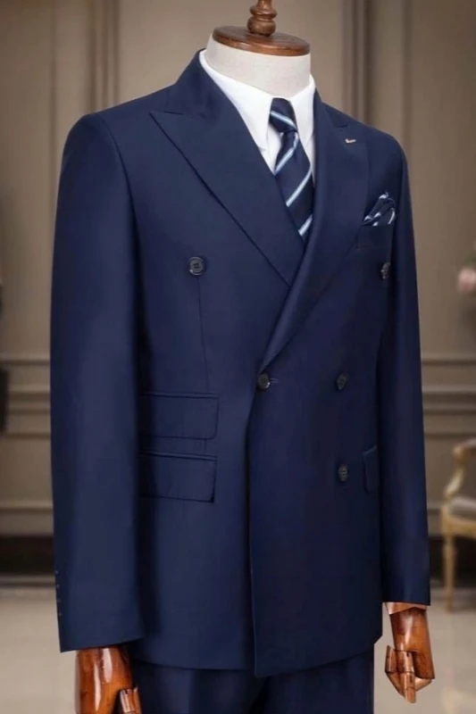 A classic navy blue double-breasted peak lapel suit, composed and traditional, suitable for all ages and skin tones. The clean lines make it look smart and upright, making it very suitable for fathers who have matured over the years.
