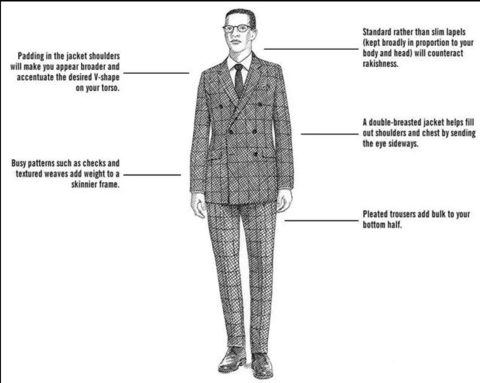 For slimmer individuals, a three-piece suit (including a vest) is highly recommended, as it adds bulk to your upper body. Don't underestimate the effect of a vest; when worn with a suit, it creates a layered look that visually helps to shape your figure.