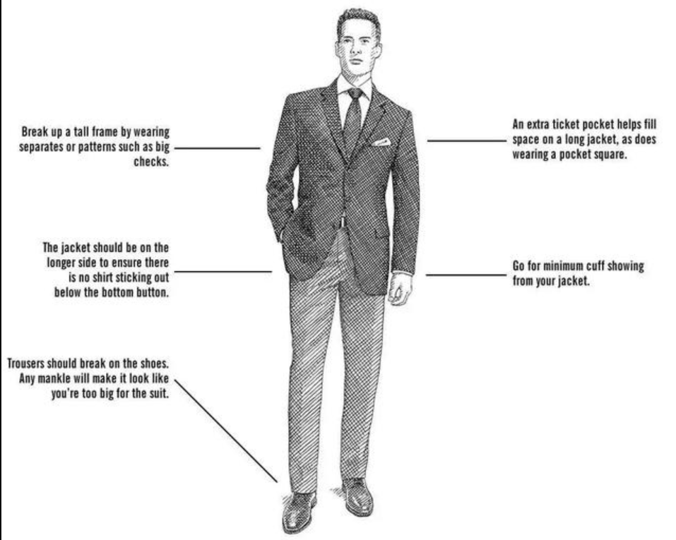 The problem for tall people is that suits often look like they've shrunk. To avoid this, the right sleeve length, jacket length, and trouser length are especially important.