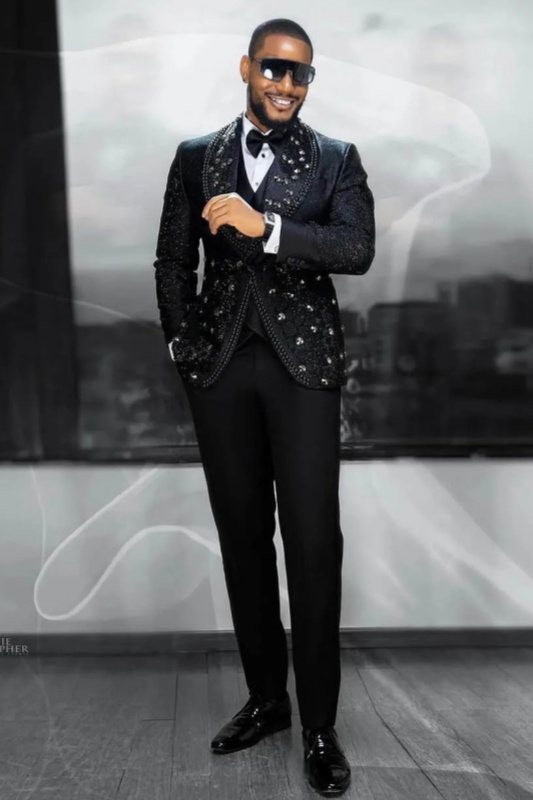 This image shows a man wearing a gorgeous black jacquard beaded suit, the overall look exuding a sense of ceremony and modern luxury.