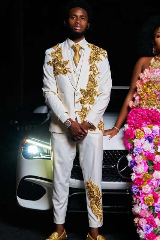 He wore a white three-piece suit, including a blazer, vest, and cropped trousers, adorned with large gold applique sequins that extended from the shoulders and chest to the trouser legs, creating a dazzling and glamorous look. He paired it with a white shirt and a matching gold tie, and finished the outfit with gold studded loafers. The overall look was both formal and individualistic, exuding confidence and prestige. This outfit combines the ornate embellishments of traditional attire with the ceremonial feel of modern ball gowns, making it perfect for important occasions such as graduation balls, weddings, or high-end celebrations, showcasing a strong sense of cultural confidence and a fashionable attitude.