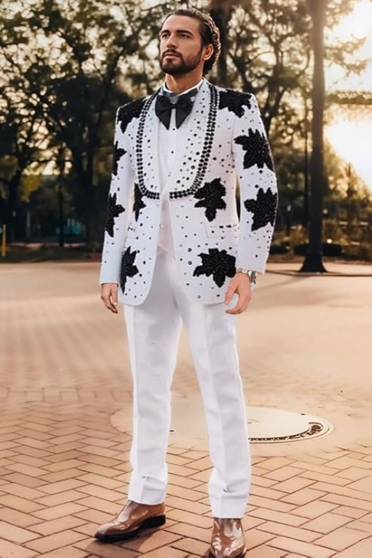 This image shows a man wearing a striking white beaded suit, perfect for formal occasions such as prom, red carpet events, or upscale dinners.