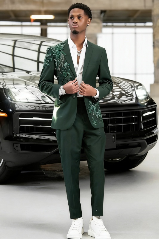 Main Look: He wears a dark green, slim-fit suit. The right shoulder and hem of the jacket are adorned with large, matching sequined appliques, creating a layered effect under the light and breaking the monotony of a traditional suit. He wears an unbuttoned white shirt underneath, revealing a necklace that adds a touch of casualness and individuality. This outfit is perfect for graduation balls, fashion events, or upscale parties, striking a balance between formality and personal style and confidence.